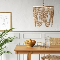 Beautify your living room lighting with the Beige Large Wooden Beads Chandelier from Threshold™. This large chandelier makes a welcoming addition to your indoor space. It features multiple strands of wooden beads draped over a wire frame in dramatic scallops that form a waterfall shape for beautiful decorative style. The neutral beige color brings easy coordination with any decor, while the one-way light setting with an on/off switch allows for easy operation.